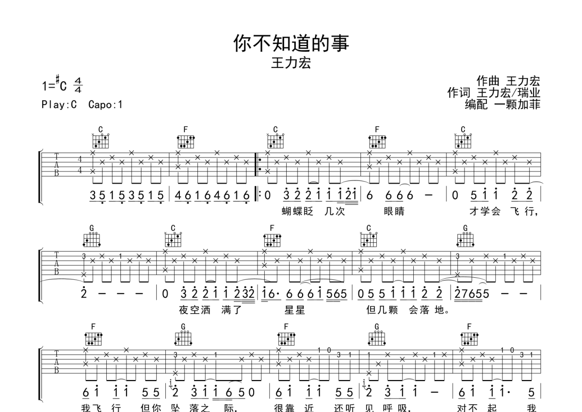 王力宏《你不知道的事》吉他谱 - C调弹唱六线谱
