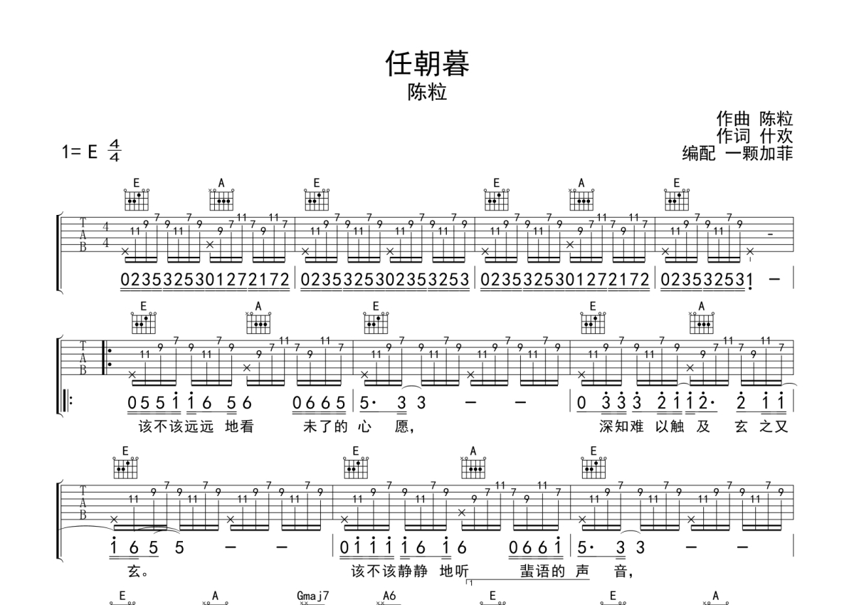 陈粒《任朝暮》吉他谱 - E调弹唱六线谱