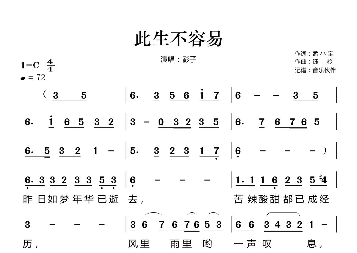 《此生不容易》是影子演唱的一首歌曲,这份简谱共有两张高清图谱,图谱由 @音乐伙伴 编配上传。