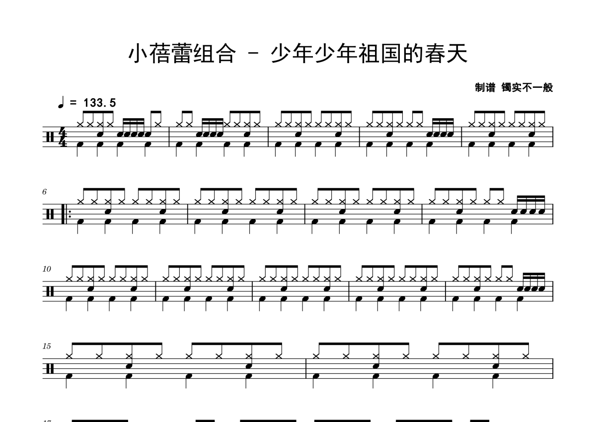 《少年少年祖国的春天》是小蓓蕾组合演唱的一首歌曲,拍号为4/4拍,歌曲速度为每分钟133拍,这份鼓谱共有两张高清图谱,图谱由 @老虎不说谎 编配上传,图谱使用五线谱编配,使用这份少年少年祖国的春天架子鼓谱,你将能够轻松地敲打出这首小蓓蕾组合的少年少年祖国的春天,快来尝试吧。