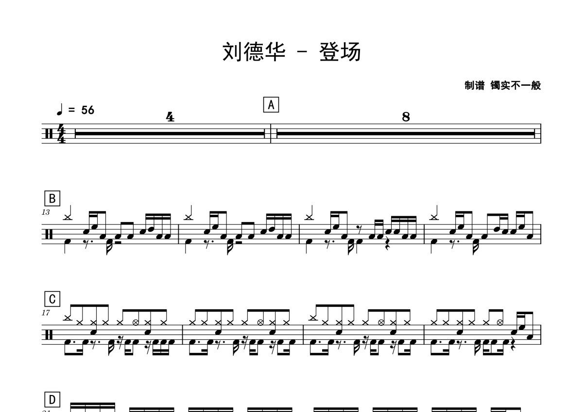 《登场》是刘德华演唱的一首歌曲,拍号为4/4拍,歌曲速度为每分钟56拍,这份鼓谱共有两张高清图谱,图谱由 @老虎不说谎 编配上传,图谱使用五线谱编配,使用这份登场架子鼓谱,你将能够轻松地敲打出这首刘德华的登场,快来尝试吧。