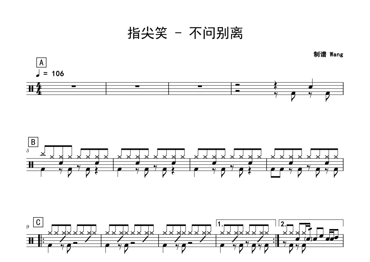 《不问别离》是指尖笑演唱的一首歌曲,拍号为4/4拍,歌曲速度为每分钟106拍,这份鼓谱共有两张高清图谱,图谱由 @老虎不说谎 编配上传,图谱使用五线谱编配,使用这份不问别离架子鼓谱,你将能够轻松地敲打出这首指尖笑的不问别离,快来尝试吧。
