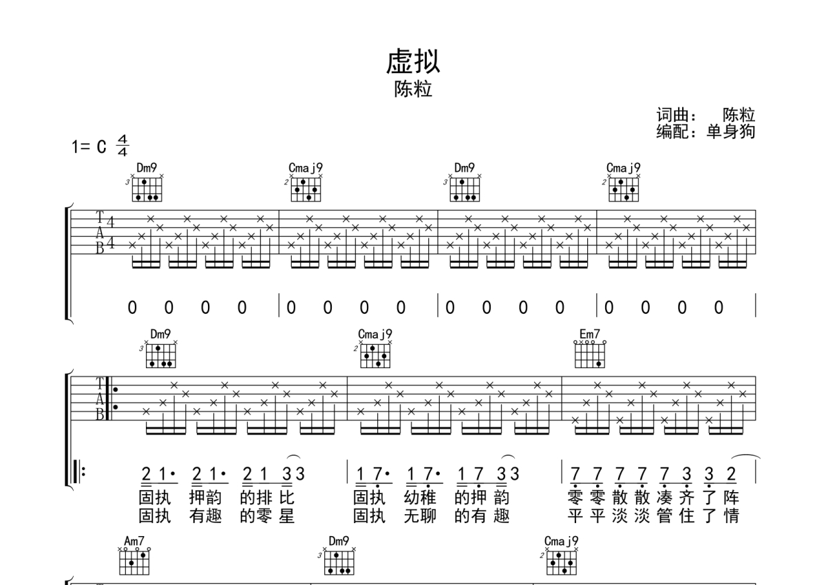 陈粒《虚拟》吉他谱 - C调弹唱六线谱