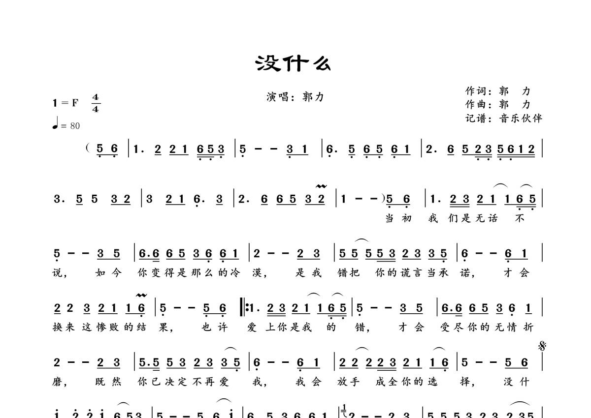 《没什么》是郭力演唱的一首歌曲,拍号为4/4拍,歌曲速度为每分钟80拍,这份简谱共有一张高清图谱,图谱由 @音乐伙伴 编配上传。