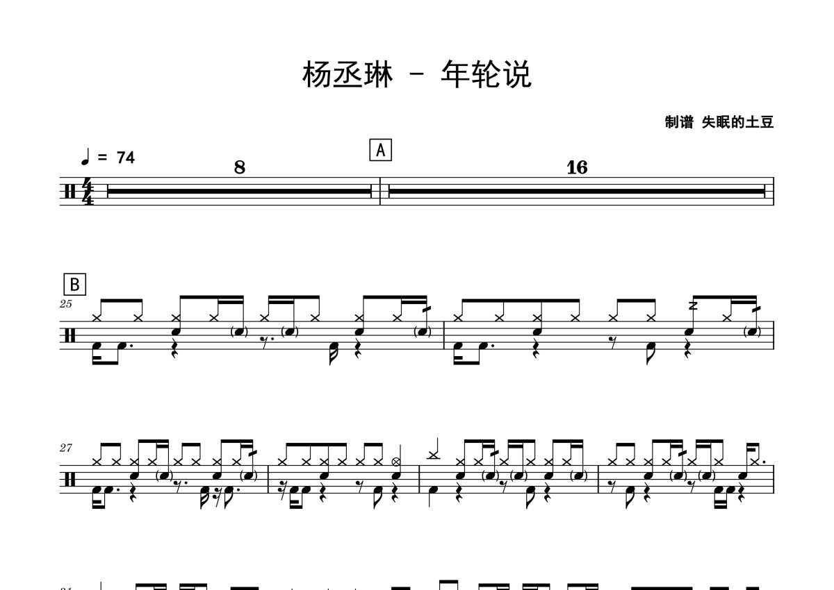 《年轮说》是杨丞琳演唱的一首歌曲,拍号为4/4拍,歌曲速度为每分钟74拍,这份鼓谱共有两张高清图谱,图谱由 @老虎不说谎 编配上传,图谱使用五线谱编配,使用这份年轮说架子鼓谱,你将能够轻松地敲打出这首杨丞琳的年轮说,快来尝试吧。