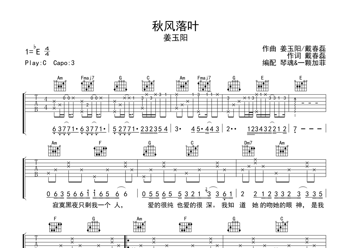 姜玉阳《秋风落叶》吉他谱 - C调弹唱六线谱