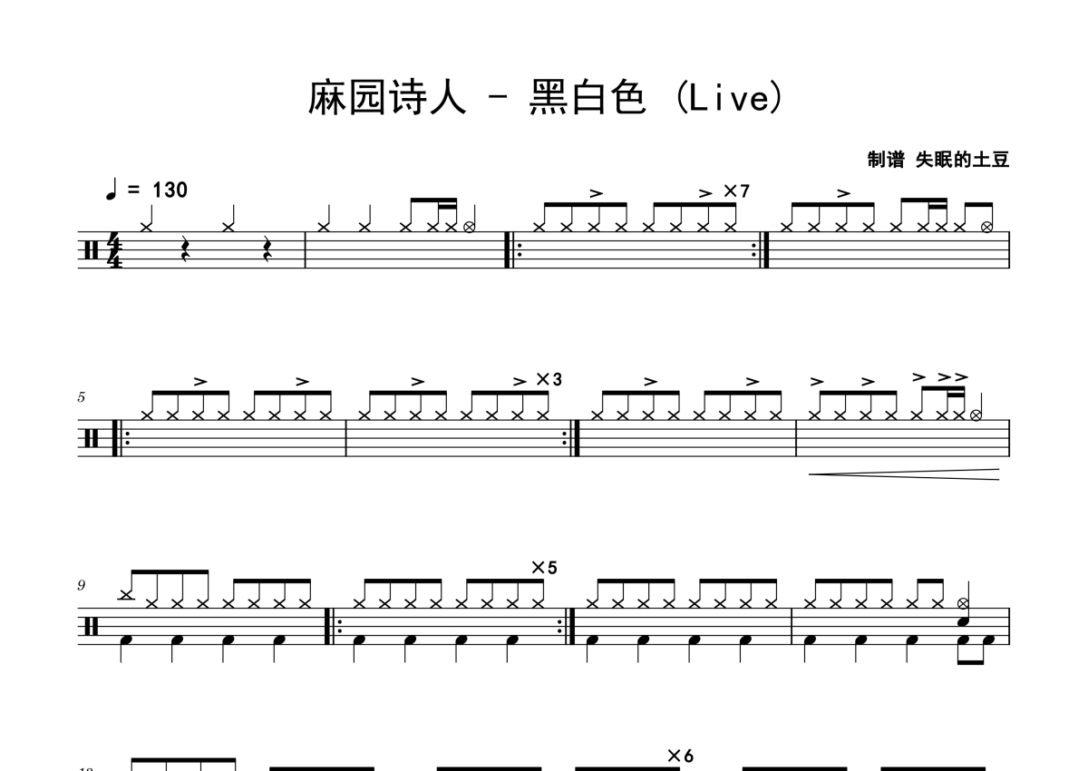 麻园诗人《黑白色》鼓谱 - 架子鼓谱 - Live