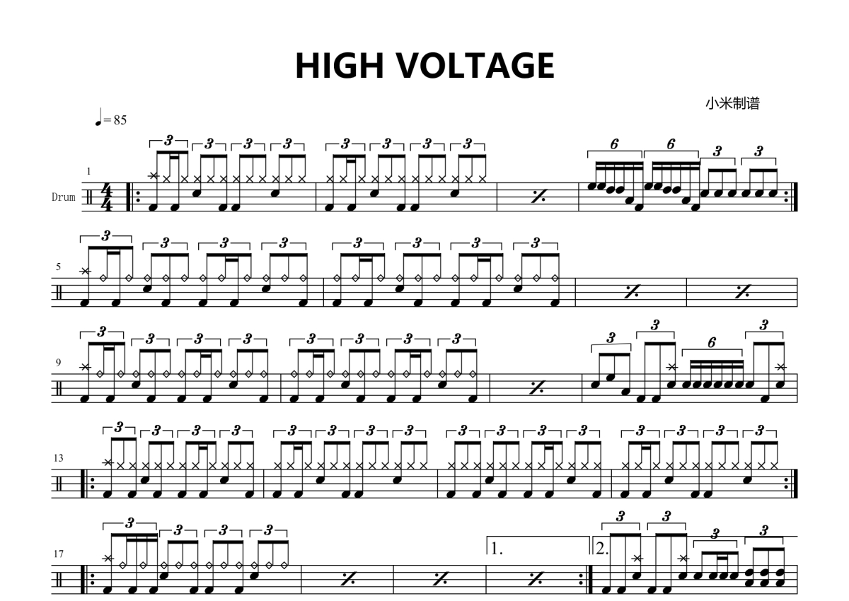 《HIGH VOLTAGE》是比赛演唱的一首歌曲,拍号为4/4拍,歌曲速度为每分钟85拍,这份鼓谱共有一张高清图谱,图谱由 @小米鼓谱 编配上传,图谱使用五线谱编配,使用这份HIGH VOLTAGE架子鼓谱,你将能够轻松地敲打出这首比赛的HIGH VOLTAGE,快来尝试吧。