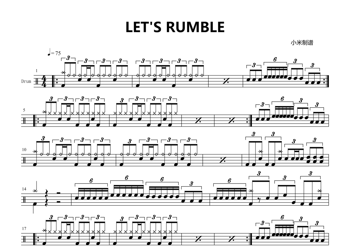 《LET'S RUMBLE》是比赛演唱的一首歌曲,拍号为4/4拍,歌曲速度为每分钟75拍,这份鼓谱共有一张高清图谱,图谱由 @小米鼓谱 编配上传,图谱使用五线谱编配,使用这份LET'S RUMBLE架子鼓谱,你将能够轻松地敲打出这首比赛的LET'S RUMBLE,快来尝试吧。