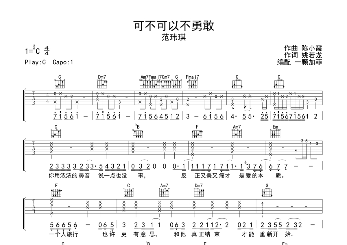 《可不可以不勇敢》是范玮琪演唱的一首歌曲,拍号为4/4拍,歌曲原调为Db调,但由于原调指法比较难,为了方便弹奏,本吉他谱采用的是C调指法编配,变调夹1品弹奏即为原调,当然也可以根据自己的音域改变变调夹位置,或者通过改变和弦调性,以方便自己弹奏,这份吉他谱共有两张高清图谱,图谱由 @一颗加菲 编配上传,图谱使用六线谱编配,包含吉他和弦指法、简谱以及歌词部分,曲谱配备了相关的音频提供试听,使用这份可不可以不勇敢吉他谱,可以让你更加方便地掌握这首歌曲的弹唱技巧,快来尝试吧。