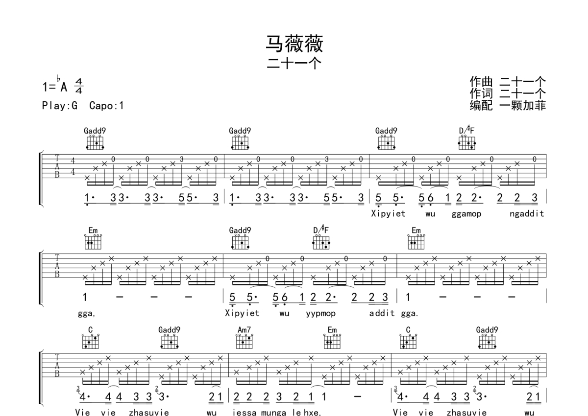 二十一个《马薇薇》吉他谱 - G调弹唱六线谱