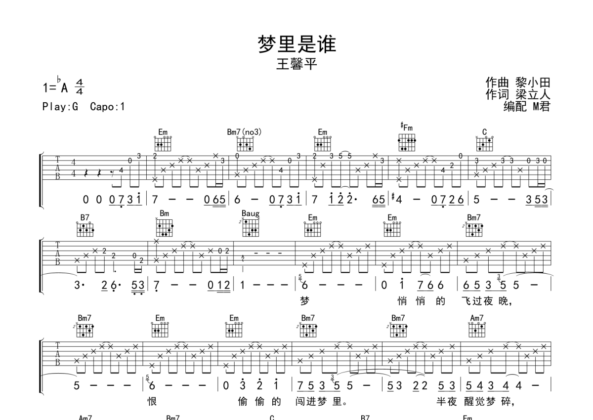 《梦里是谁》是王馨平演唱的一首歌曲,拍号为4/4拍,歌曲原调为Ab调,但由于原调指法比较难,为了方便弹奏,本吉他谱采用的是G调指法编配,变调夹1品弹奏即为原调,当然也可以根据自己的音域改变变调夹位置,或者通过改变和弦调性,以方便自己弹奏,这份吉他谱共有两张高清图谱,图谱由 @一颗加菲 编配上传,图谱使用六线谱编配,包含吉他和弦指法、简谱以及歌词部分,曲谱配备了相关的音频提供试听,使用这份梦里是谁吉他谱,可以让你更加方便地掌握这首歌曲的弹唱技巧,快来尝试吧。