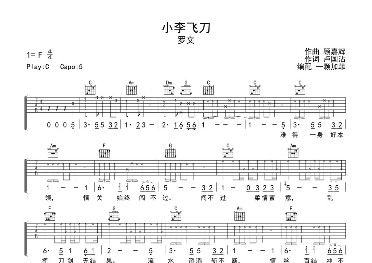 罗文《小李飞刀》吉他谱 - C调弹唱六线谱