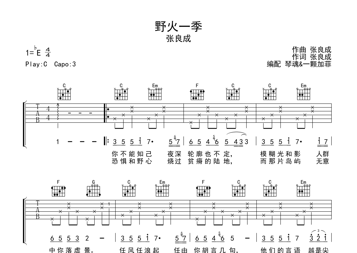 张良成《野火一季》吉他谱 - C调弹唱六线谱