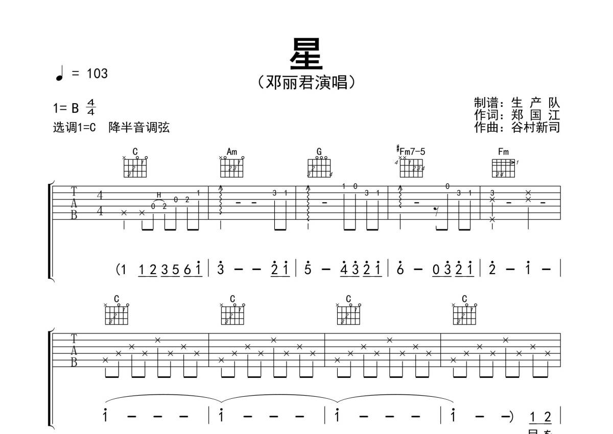 《星(Live)》是邓丽君演唱的一首歌曲,精编完美版,拍号为4/4拍,歌曲速度为每分钟103拍,歌曲原调为B调,但由于原调指法比较难,为了方便弹奏,本吉他谱采用的是C调指法编配,降半音调弦弹奏即为原调,当然也可以根据自己的音域决定是否调弦,这份吉他谱共有三张高清图谱,图谱由 @生产队 编配上传,图谱使用六线谱编配,包含吉他和弦指法、简谱以及歌词部分,使用这份星(Live)吉他谱,可以让你更加方便地掌握这首歌曲的弹唱技巧,快来尝试吧。《星》是邓丽君演唱的歌曲,由郑国江作词,谷村新司作曲,收录在环球唱片2009年发行的群星专辑《Elements -现场歌曲》中。本吉他谱根据原版采用C调指法编配,精准的前奏、间奏、尾奏及SOLO编配,怀旧经典!。