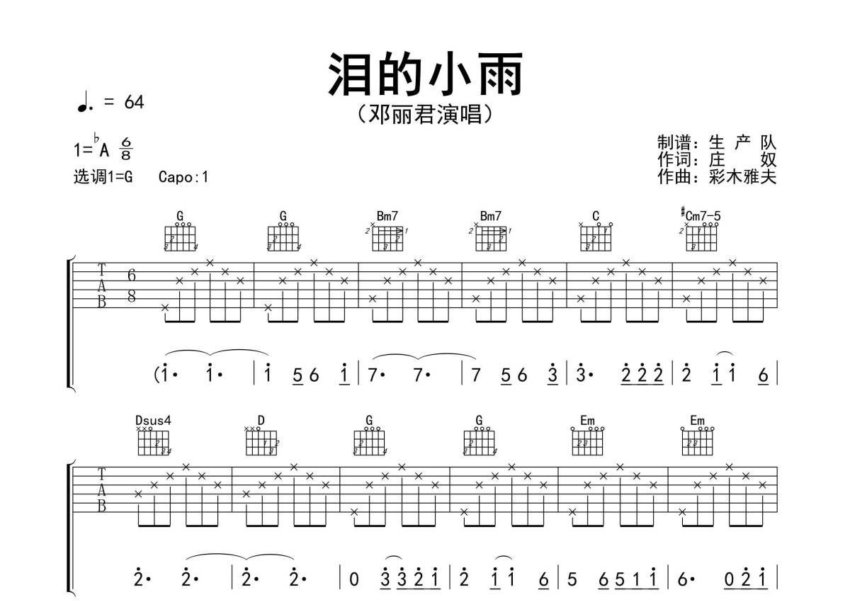 《泪的小雨》是邓丽君演唱的一首歌曲,精编完美版,拍号为6/8拍,歌曲速度为每分钟64拍,歌曲原调为Ab调,但由于原调指法比较难,为了方便弹奏,本吉他谱采用的是G调指法编配,变调夹1品弹奏即为原调,当然也可以根据自己的音域改变变调夹位置,或者通过改变和弦调性,以方便自己弹奏,这份吉他谱共有三张高清图谱,图谱由 @生产队 编配上传,图谱使用六线谱编配,包含吉他和弦指法、简谱以及歌词部分,使用这份泪的小雨吉他谱,可以让你更加方便地掌握这首歌曲的弹唱技巧,快来尝试吧。《泪的小雨》是邓丽君演唱歌曲,由庄奴作词、彩木雅夫作曲,该歌曲最早收录在邓丽君1970年专辑《玫瑰姑娘》中。本吉他谱根据原版采用G调指法编配,精准的前奏、间奏、尾奏及SOLO编配,怀旧经典!。