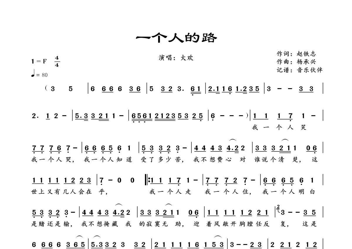 大欢《一个人的路》简谱