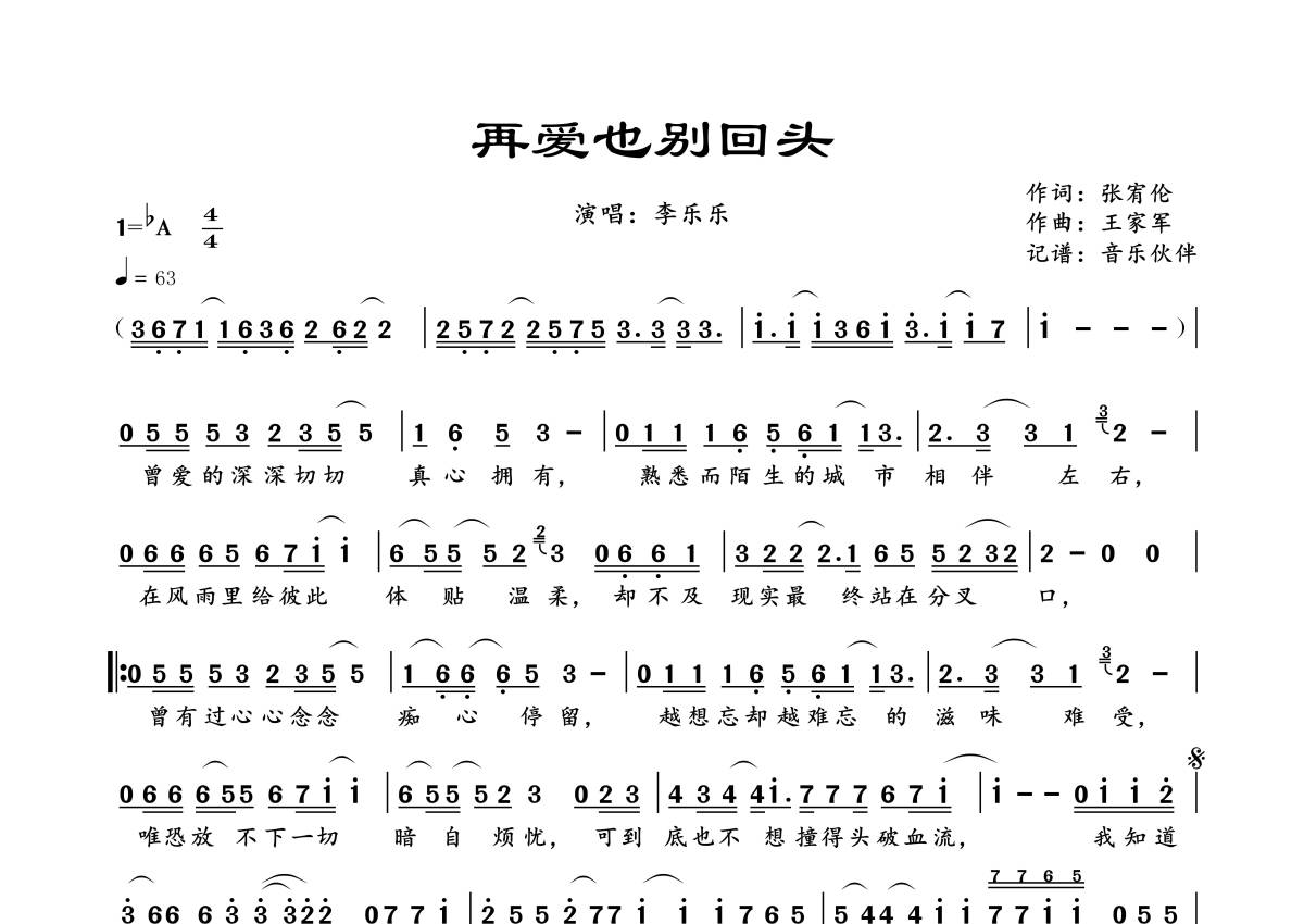 《再爱也别回头》是李乐乐演唱的一首歌曲,拍号为4/4拍,这份简谱共有一张高清图谱,图谱由 @音乐伙伴 编配上传。