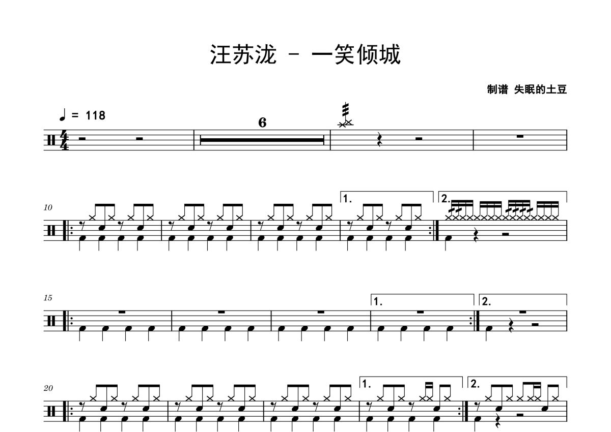 《一笑倾城》是汪苏泷演唱的一首歌曲,拍号为4/4拍,歌曲速度为每分钟118拍,这份鼓谱共有两张高清图谱,图谱由 @老虎不说谎 编配上传,图谱使用五线谱编配,使用这份一笑倾城架子鼓谱,你将能够轻松地敲打出这首汪苏泷的一笑倾城,快来尝试吧。
