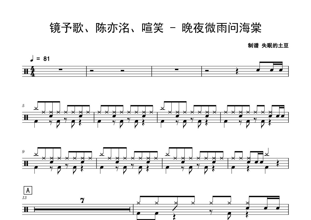 镜予歌、陈亦洺、喧笑《晚夜微雨问海棠》鼓谱 - 架子鼓谱