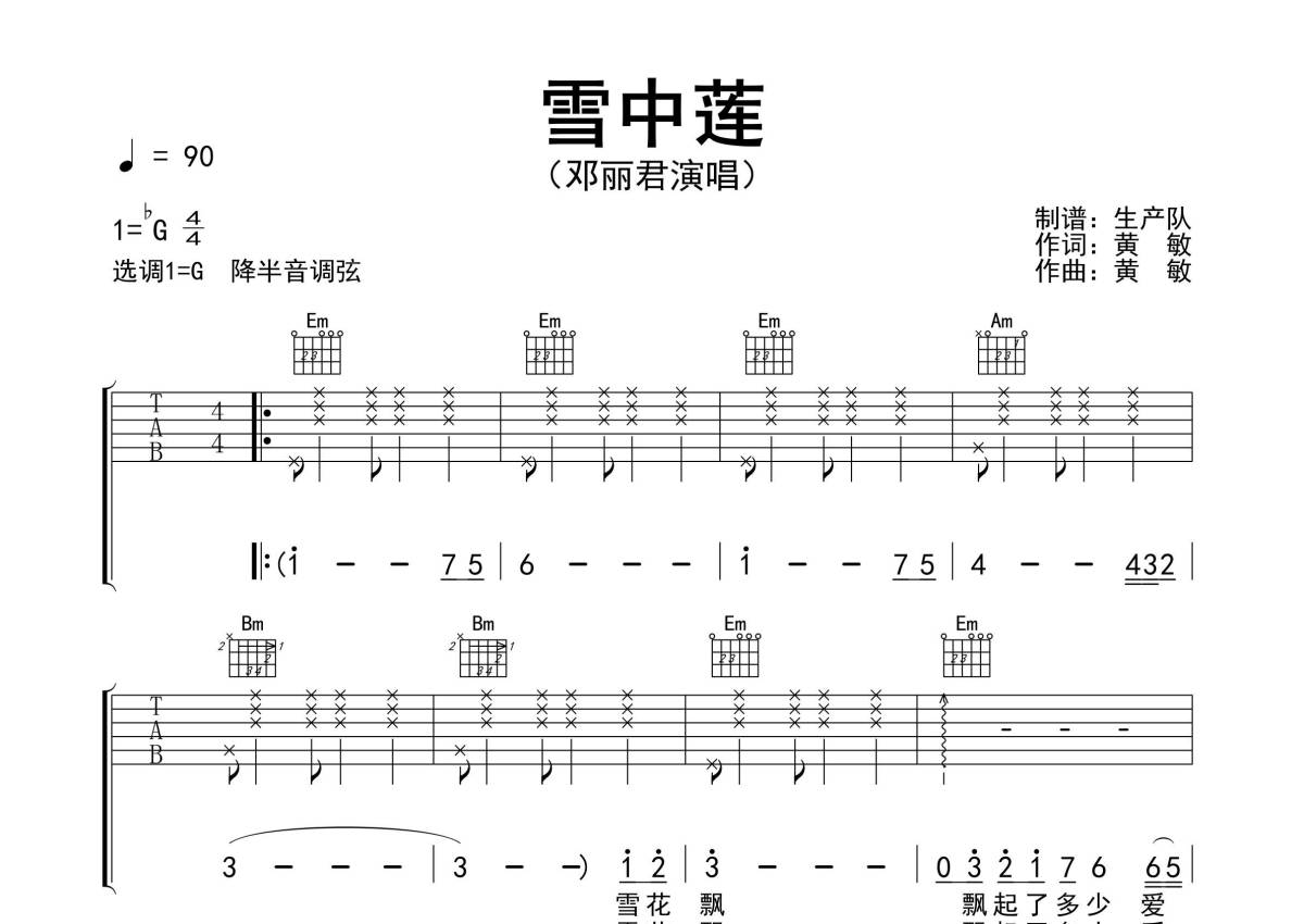 《雪中莲》是邓丽君演唱的一首歌曲,精编完美版,拍号为4/4拍,歌曲速度为每分钟90拍,歌曲原调为Gb调,但由于原调指法比较难,为了方便弹奏,本吉他谱采用的是G调指法编配,降半音调弦弹奏即为原调,当然也可以根据自己的音域决定是否调弦,这份吉他谱共有两张高清图谱,图谱由 @生产队 编配上传,图谱使用六线谱编配,包含吉他和弦指法、简谱以及歌词部分,使用这份雪中莲吉他谱,可以让你更加方便地掌握这首歌曲的弹唱技巧,快来尝试吧。《雪中莲》是新加坡电视剧《塞外奇侠传》片尾曲,雪中莲即天山雪莲,原唱为邓丽君,收录在邓丽君1980年6月的专辑《一个小心愿》中。本吉他谱根据原版采用G调指法编配,精准的前奏、间奏、尾奏及SOLO编配,怀旧经典!。
