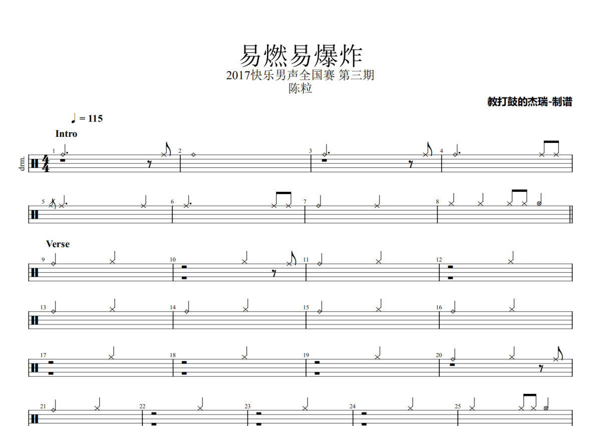 《易燃易爆炸》是陈粒演唱的一首歌曲,2017快乐男声全国赛 第三期Live,拍号为4/4拍,歌曲速度为每分钟115拍,这份鼓谱共有两张高清图谱,图谱由 @Jerry 编配上传,图谱使用五线谱编配,使用这份易燃易爆炸架子鼓谱,你将能够轻松地敲打出这首陈粒的易燃易爆炸,快来尝试吧。