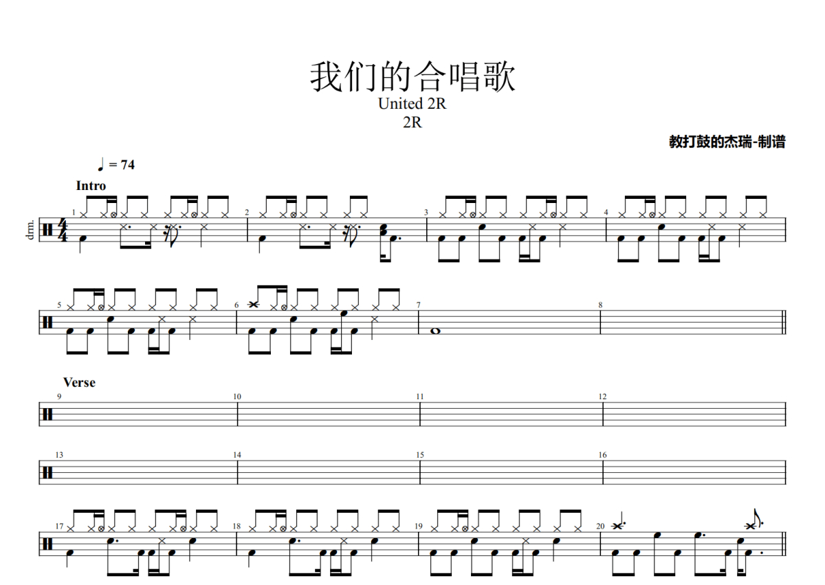 《我们的合唱歌》是2R演唱的一首歌曲,拍号为4/4拍,歌曲速度为每分钟74拍,这份鼓谱共有两张高清图谱,图谱由 @Jerry 编配上传,图谱使用五线谱编配,使用这份我们的合唱歌架子鼓谱,你将能够轻松地敲打出这首2R的我们的合唱歌,快来尝试吧。