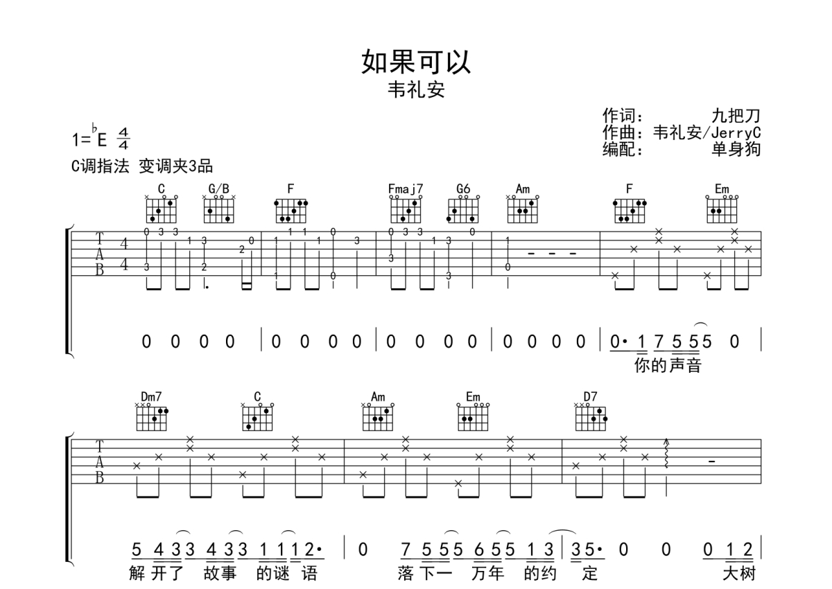 《如果可以》是韦礼安演唱的一首歌曲,拍号为4/4拍,歌曲原调为Eb调,但由于原调指法比较难,为了方便弹奏,本吉他谱采用的是C调指法编配,变调夹3品弹奏即为原调,当然也可以根据自己的音域改变变调夹位置,或者通过改变和弦调性,以方便自己弹奏,这份吉他谱共有四张高清图谱,图谱由 @单身狗 编配上传,图谱使用六线谱编配,包含吉他和弦指法、简谱以及歌词部分,使用这份如果可以吉他谱,可以让你更加方便地掌握这首歌曲的弹唱技巧,快来尝试吧。