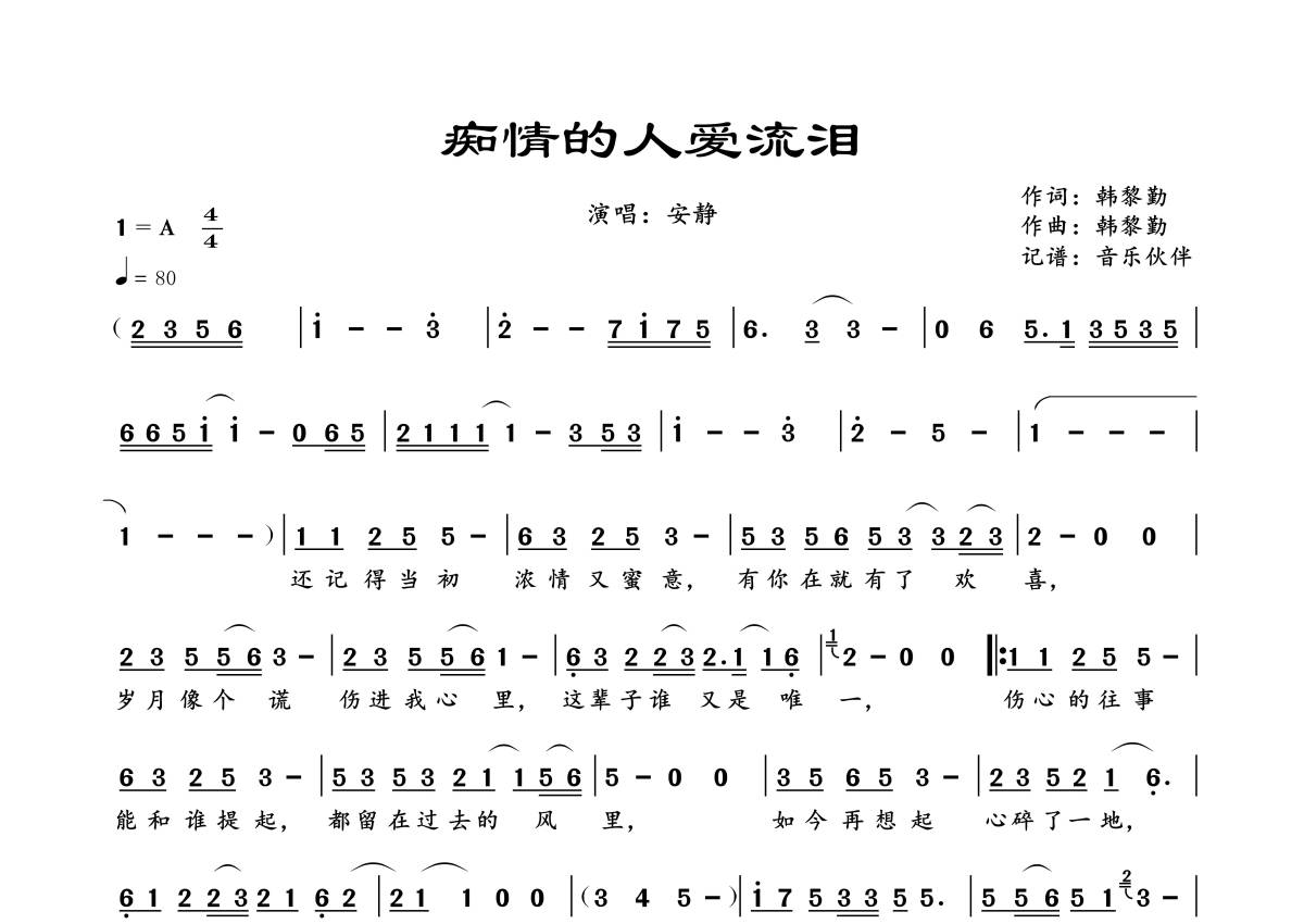 《痴情的人爱流泪》是安静演唱的一首歌曲,拍号为4/4拍,歌曲速度为每分钟80拍,这份简谱共有一张高清图谱,图谱由 @音乐伙伴 编配上传。