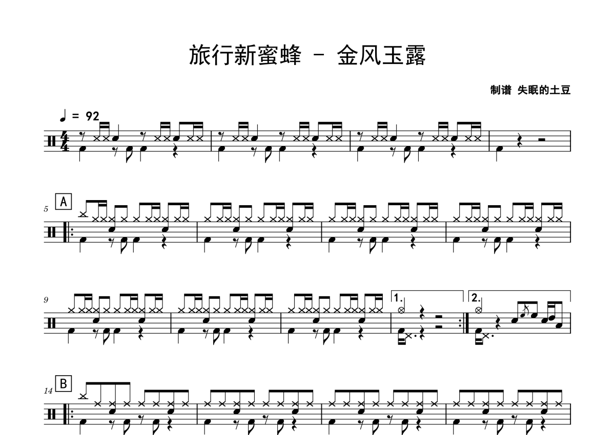 《金风玉露》是旅行新蜜蜂演唱的一首歌曲,拍号为4/4拍,歌曲速度为每分钟92拍,这份鼓谱共有两张高清图谱,图谱由 @老虎不说谎 编配上传,图谱使用五线谱编配,使用这份金风玉露架子鼓谱,你将能够轻松地敲打出这首旅行新蜜蜂的金风玉露,快来尝试吧。