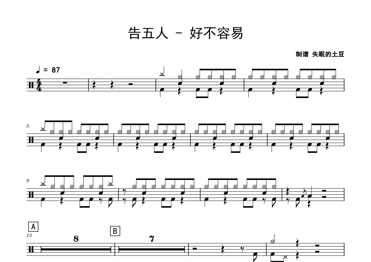 《好不容易》是告五人演唱的一首歌曲,拍号为4/4拍,歌曲速度为每分钟87拍,这份鼓谱共有两张高清图谱,图谱由 @老虎不说谎 编配上传,图谱使用五线谱编配,使用这份好不容易架子鼓谱,你将能够轻松地敲打出这首告五人的好不容易,快来尝试吧。