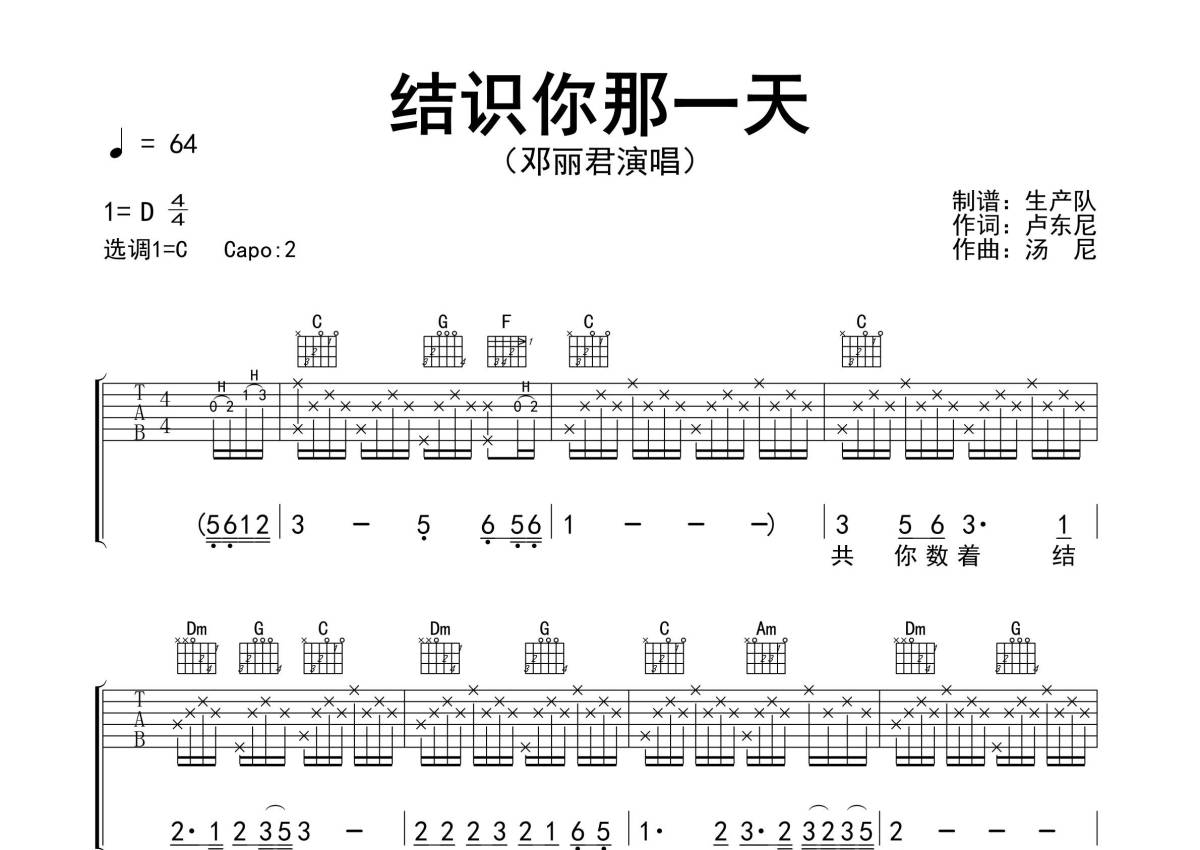 《结识你那一天》是邓丽君演唱的一首歌曲,精编完美版,拍号为4/4拍,歌曲速度为每分钟64拍,歌曲原调为D调,但由于原调指法比较难,为了方便弹奏,本吉他谱采用的是C调指法编配,变调夹2品弹奏即为原调,当然也可以根据自己的音域改变变调夹位置,或者通过改变和弦调性,以方便自己弹奏,这份吉他谱共有两张高清图谱,图谱由 @生产队 编配上传,图谱使用六线谱编配,包含吉他和弦指法、简谱以及歌词部分,使用这份结识你那一天吉他谱,可以让你更加方便地掌握这首歌曲的弹唱技巧,快来尝试吧。《结识你那一天》是邓丽君《甜蜜蜜》的粤语版本,由卢东尼填粤语词,卢国沾编曲,1981年12月18日,此曲收录在邓丽君于宝丽金发行的首张粤语大碟《势不两立》中。本吉他谱根据原版采用C调指法编配,完整的前奏、间奏、尾奏和SOLO编配,一音不差版,怀旧经典!。