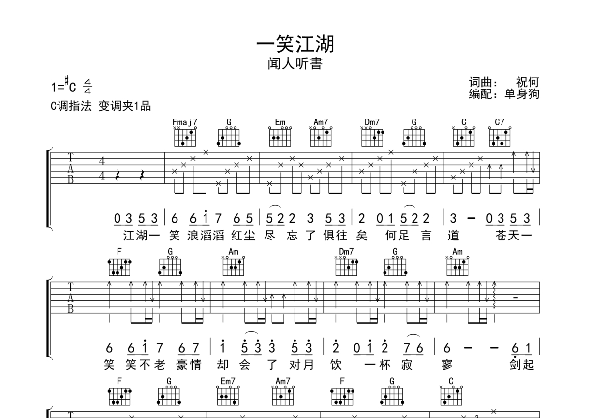 闻人听书《一笑江湖》吉他谱 - C调弹唱六线谱