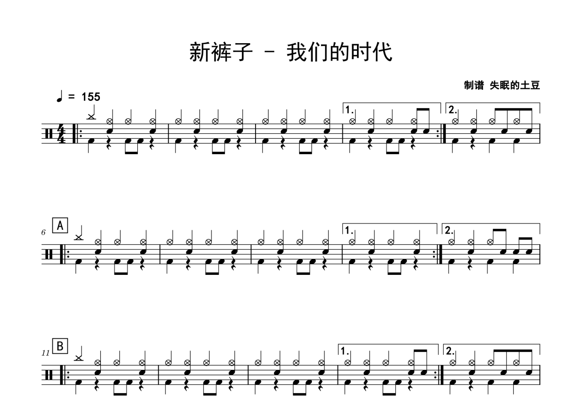 《我们的时代》是新裤子乐队演唱的一首歌曲,拍号为4/4拍,歌曲速度为每分钟155拍,这份鼓谱共有两张高清图谱,图谱由 @老虎不说谎 编配上传,图谱使用五线谱编配,使用这份我们的时代架子鼓谱,你将能够轻松地敲打出这首新裤子乐队的我们的时代,快来尝试吧。