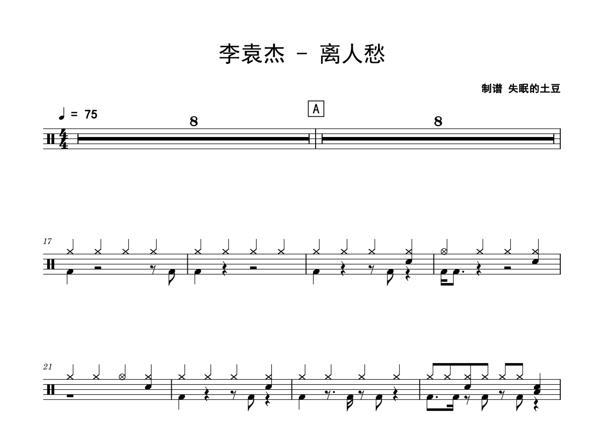 《离人愁》是李袁杰演唱的一首歌曲,拍号为4/4拍,歌曲速度为每分钟75拍,这份鼓谱共有两张高清图谱,图谱由 @老虎不说谎 编配上传,图谱使用五线谱编配,使用这份离人愁架子鼓谱,你将能够轻松地敲打出这首李袁杰的离人愁,快来尝试吧。