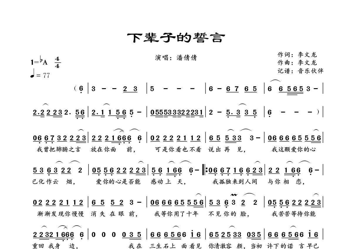 《下辈子的誓言》是潘倩倩演唱的一首歌曲,拍号为4/4拍,歌曲速度为每分钟77拍,这份简谱共有一张高清图谱,图谱由 @音乐伙伴 编配上传。