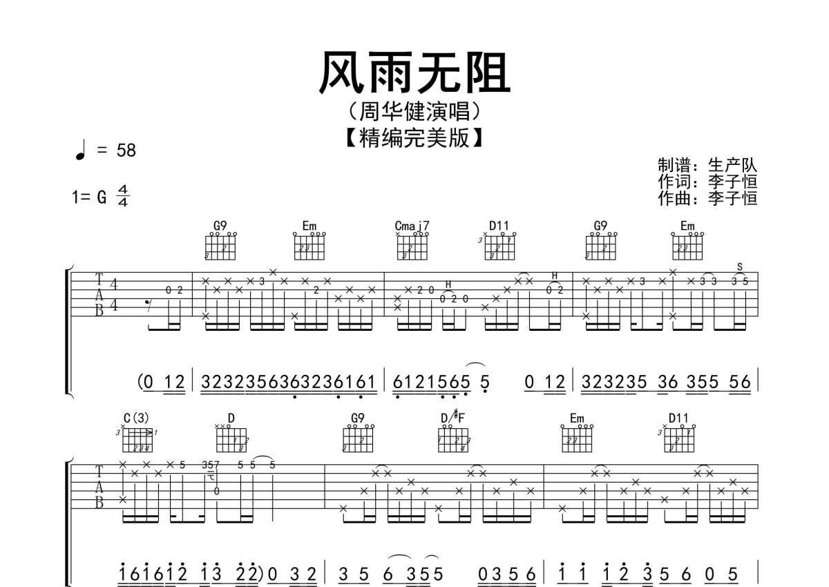 《风雨无阻》是周华健演唱的一首歌曲,精编完美版,拍号为4/4拍,歌曲速度为每分钟58拍,歌曲原调为G调,本吉他谱采用的是G调指法编配,演奏时不需要使用变调夹即为原调,这份吉他谱共有三张高清图谱,图谱由 @生产队 编配上传,图谱使用六线谱编配,包含吉他和弦指法、简谱以及歌词部分,使用这份风雨无阻吉他谱,可以让你更加方便地掌握这首歌曲的弹唱技巧,快来尝试吧。《风雨无阻》是周华健演唱的一首歌曲,由李子恒作词、作曲,包小松编曲,收录在周华健1994年6月10日发行的专辑《风雨无阻》中。本吉他谱根据原版G调指法编配,精准的前奏、间奏、尾奏及SOLO完美版编配,怀旧经典!。