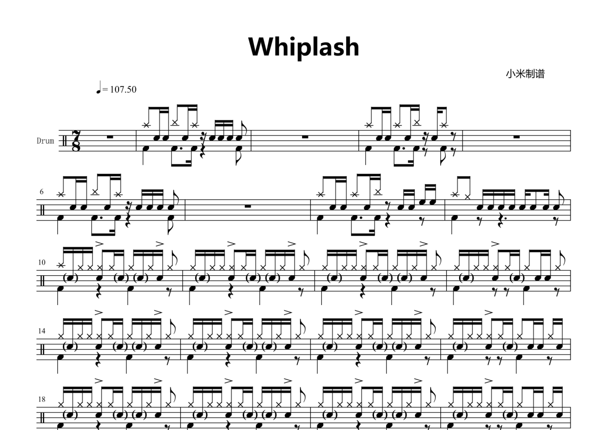 《whiplash》是爆裂鼓手演唱的一首歌曲,歌曲速度为每分钟108拍,这份鼓谱共有两张高清图谱,图谱由 @小米鼓谱 编配上传,图谱使用五线谱编配,使用这份whiplash架子鼓谱,你将能够轻松地敲打出这首爆裂鼓手的whiplash,快来尝试吧。