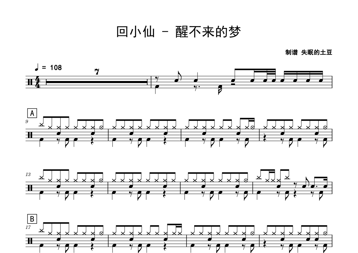 《醒不来的梦》是回小仙演唱的一首歌曲,拍号为4/4拍,歌曲速度为每分钟108拍,这份鼓谱共有三张高清图谱,图谱由 @老虎不说谎 编配上传,图谱使用五线谱编配,使用这份醒不来的梦架子鼓谱,你将能够轻松地敲打出这首回小仙的醒不来的梦,快来尝试吧。