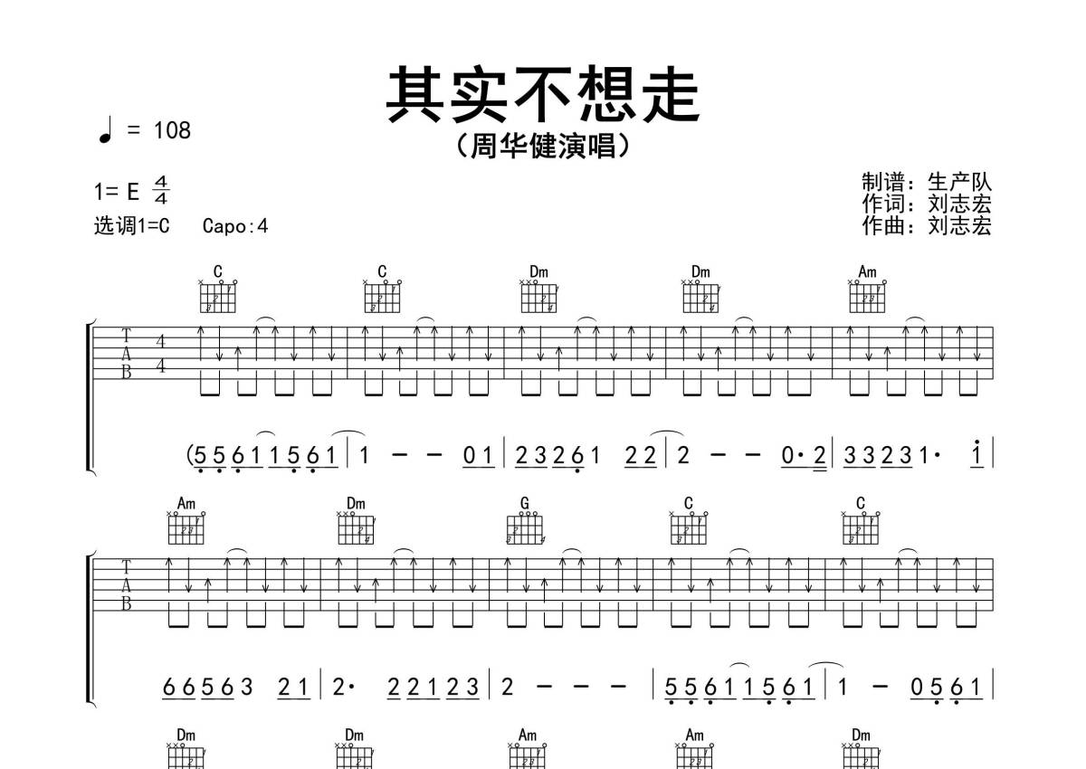 《其实不想走》是周华健演唱的一首歌曲,精编完美版,拍号为4/4拍,歌曲速度为每分钟108拍,歌曲原调为E调,但由于原调指法比较难,为了方便弹奏,本吉他谱采用的是C调指法编配,变调夹4品弹奏即为原调,当然也可以根据自己的音域改变变调夹位置,或者通过改变和弦调性,以方便自己弹奏,这份吉他谱共有三张高清图谱,图谱由 @生产队 编配上传,图谱使用六线谱编配,包含吉他和弦指法、简谱以及歌词部分,使用这份其实不想走吉他谱,可以让你更加方便地掌握这首歌曲的弹唱技巧,快来尝试吧。《其实不想走》是周华健演唱的一首歌曲,由刘志宏作词、作曲,洪敬尧编曲,收录在周华健1994年6月10日由滚石唱片发行的专辑《风雨无阻》中。本吉他谱根据原版采用C调指法编配,完整的前奏、间奏编配,怀旧经典!。