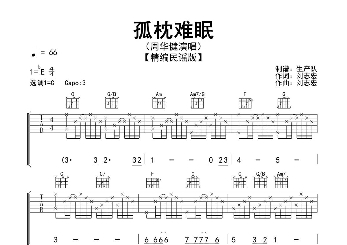 《孤枕难眠》是周华健演唱的一首歌曲,精编民谣版,拍号为4/4拍,歌曲速度为每分钟66拍,歌曲原调为Eb调,但由于原调指法比较难,为了方便弹奏,本吉他谱采用的是C调指法编配,变调夹3品弹奏即为原调,当然也可以根据自己的音域改变变调夹位置,或者通过改变和弦调性,以方便自己弹奏,这份吉他谱共有三张高清图谱,图谱由 @生产队 编配上传,图谱使用六线谱编配,包含吉他和弦指法、简谱以及歌词部分,使用这份孤枕难眠吉他谱,可以让你更加方便地掌握这首歌曲的弹唱技巧,快来尝试吧。《孤枕难眠》是周华健演唱的一首歌曲,刘志宏作词、作曲,洪敬尧编曲,收录于周华健1993年4月20日由滚石唱片发行的专辑《花心》中。本吉他谱根据原版采用C调指法编配的特别适合吉他弹唱的民谣版本,完整的前奏、间奏、尾奏编配,效果很棒,注意Bass的魅力,怀旧经典!。