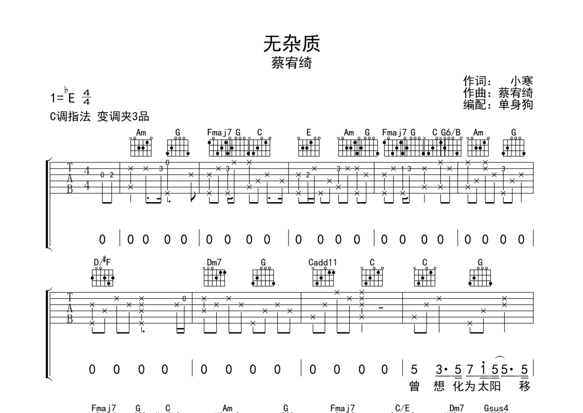 《无杂质》是蔡宥绮演唱的一首歌曲,拍号为4/4拍,歌曲原调为Eb调,但由于原调指法比较难,为了方便弹奏,本吉他谱采用的是C调指法编配,变调夹3品弹奏即为原调,当然也可以根据自己的音域改变变调夹位置,或者通过改变和弦调性,以方便自己弹奏,这份吉他谱共有四张高清图谱,图谱由 @单身狗 编配上传,图谱使用六线谱编配,包含吉他和弦指法、简谱以及歌词部分,使用这份无杂质吉他谱,可以让你更加方便地掌握这首歌曲的弹唱技巧,快来尝试吧。