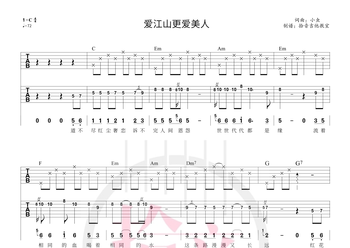 《爱江山更爱美人》是小阿枫/李丽芬演唱的一首歌曲,拍号为4/4拍,歌曲速度为每分钟72拍,本吉他谱采用的是C调指法编配,这份吉他谱共有两张高清图谱,图谱由 @拾音吉他 编配上传,图谱使用六线谱编配,曲谱配备了相关的视频提供浏览,使用这份爱江山更爱美人吉他谱,可以让你更加方便地掌握这首歌曲的演奏技巧,快来尝试吧。弹唱谱+solo谱的配置,个人弹唱和solo,或者进行双人配合皆可。