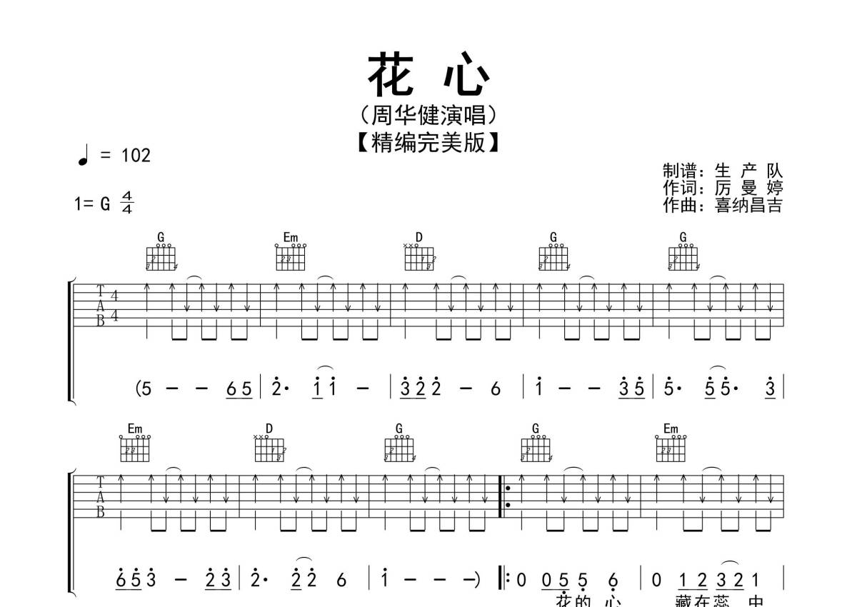《花心》是周华健演唱的一首歌曲,带间奏SOLO版,拍号为4/4拍,歌曲速度为每分钟102拍,歌曲原调为G调,本吉他谱采用的是G调指法编配,演奏时不需要使用变调夹即为原调,这份吉他谱共有三张高清图谱,图谱由 @生产队 编配上传,图谱使用六线谱编配,包含吉他和弦指法、简谱以及歌词部分,使用这份花心吉他谱,可以让你更加方便地掌握这首歌曲的弹唱技巧,快来尝试吧。《花心》是周华健演唱的一首歌曲,由厉曼婷填词,喜纳昌吉作曲,鲍比达编曲 ,收录于周华健1993年4月20日发行的同名专辑《花心》中 ,该歌曲是周华健的代表作品之一。本吉他谱根据原版G调指法编配,精准的前奏、间奏、尾奏及SOLO编配,主歌扫弦节奏,副歌切音节奏,精编一音不差版,怀旧经典!。