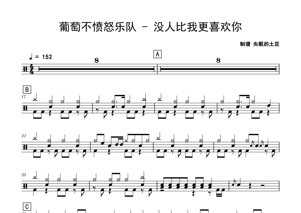 葡萄不愤怒乐队《没人比我更喜欢你》鼓谱 - 架子鼓谱