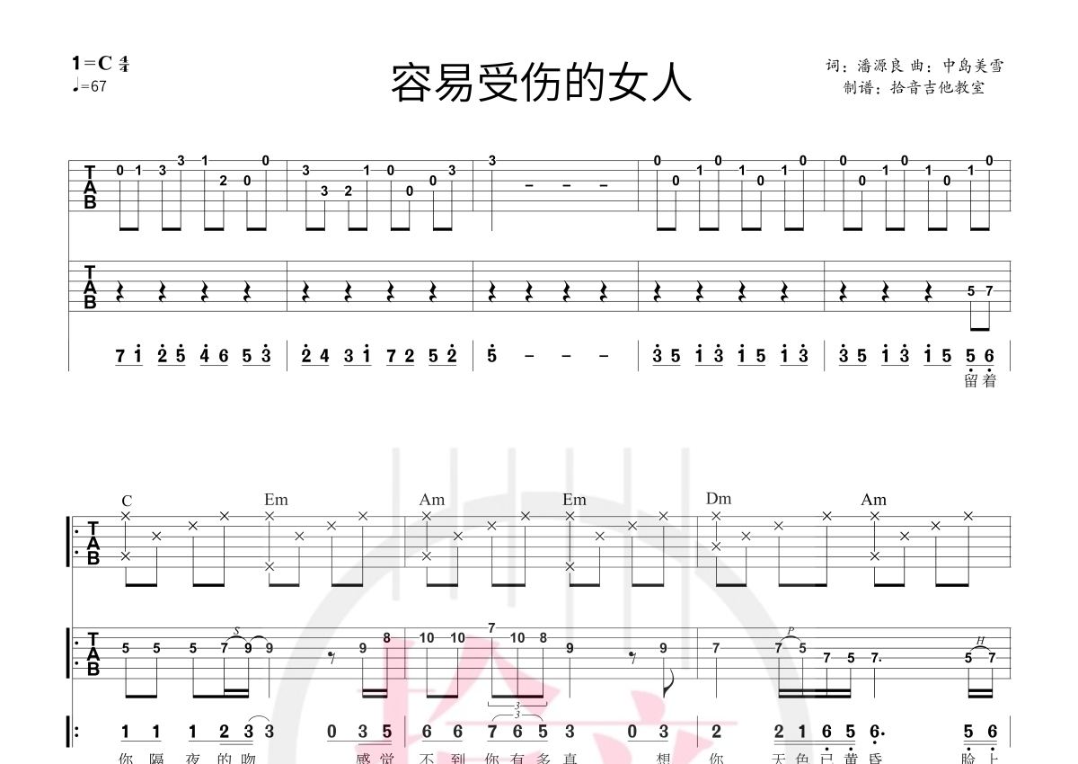 《容易受伤的女人》是王菲演唱的一首歌曲,拍号为4/4拍,歌曲速度为每分钟67拍,歌曲原调为C调,本吉他谱采用的是C调指法编配,演奏时不需要使用变调夹即为原调,这份吉他谱共有四张高清图谱,图谱由 @拾音吉他 编配上传,图谱使用六线谱编配,使用这份容易受伤的女人吉他谱,可以让你更加方便地掌握这首歌曲的演奏技巧,快来尝试吧。弹唱谱+.全曲solo谱的形式,个人弹唱和双人配合皆可。