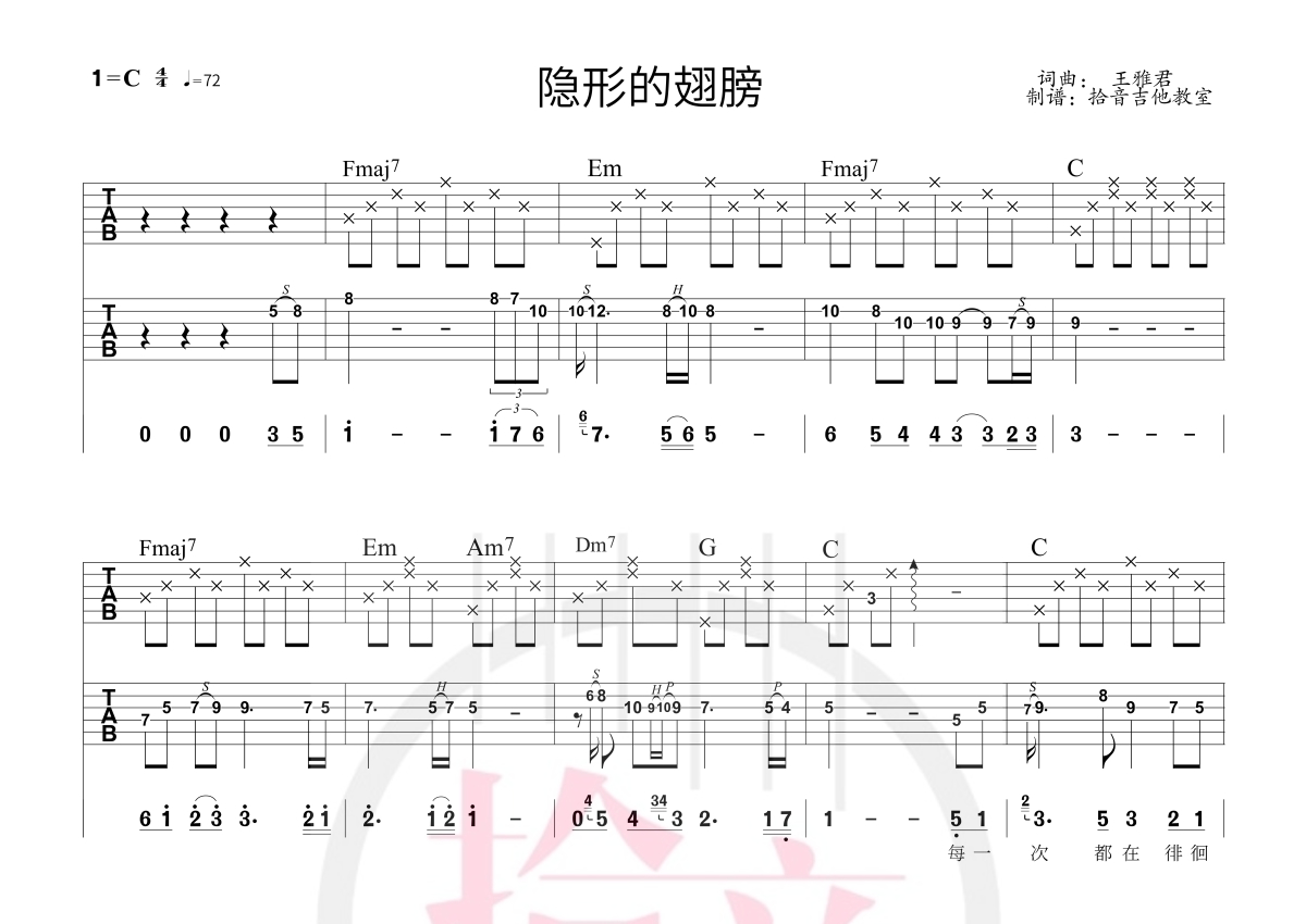 张韶涵《隐形的翅膀》吉他谱 - C调独奏solo六线谱