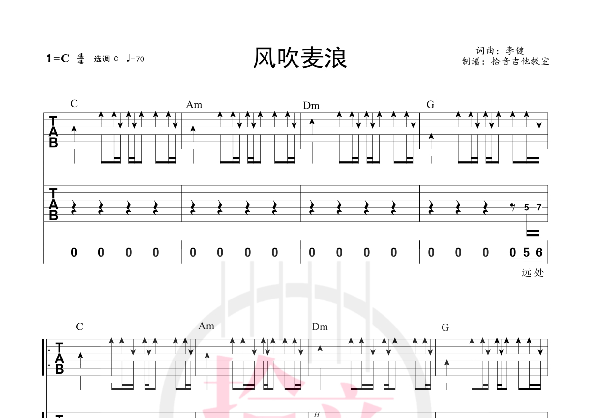 《风吹麦浪》是李健演唱的一首歌曲,拍号为4/4拍,歌曲原调为D调,但由于原调指法比较难,为了方便弹奏,本吉他谱采用的是C调指法编配,变调夹2品弹奏即为原调,当然也可以根据自己的音域改变变调夹位置,或者通过改变和弦调性,以方便自己弹奏,这份吉他谱共有两张高清图谱,图谱由 @拾音吉他 编配上传,图谱使用六线谱编配,曲谱配备了相关的视频提供浏览,使用这份风吹麦浪吉他谱,可以让你更加方便地掌握这首歌曲的演奏技巧,快来尝试吧。弹唱谱+solo谱的编配,个人弹唱和solo都可以,配有solo专用的伴奏可以下载。