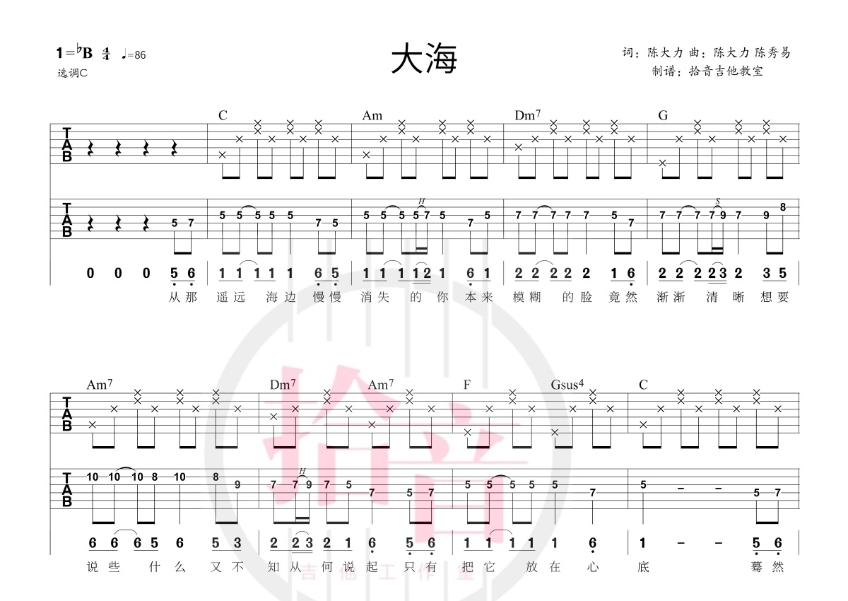 张雨生《大海》吉他谱 - C调独奏solo六线谱