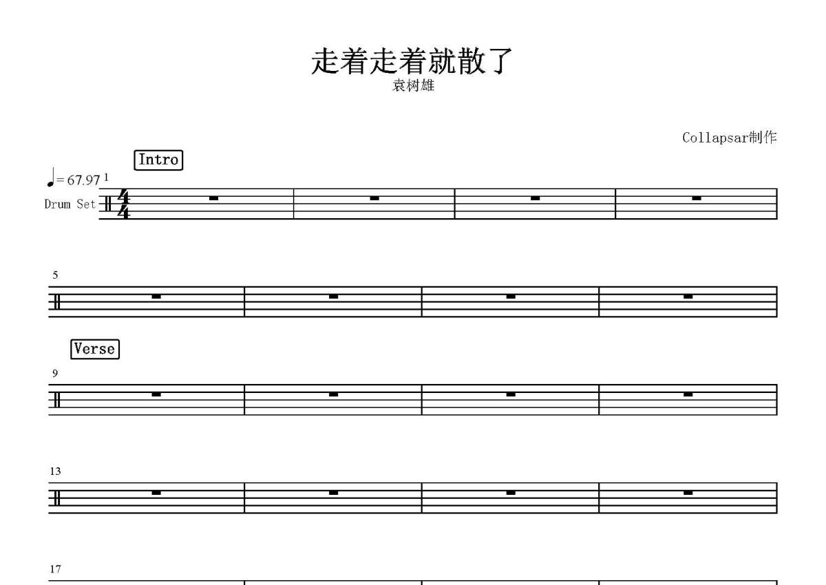 《走着走着就散了》是袁树雄演唱的一首歌曲,这份鼓谱共有三张高清图谱,图谱由 @打鼓谱 编配上传,图谱使用五线谱编配,使用这份走着走着就散了架子鼓谱,你将能够轻松地敲打出这首袁树雄的走着走着就散了,快来尝试吧。1。